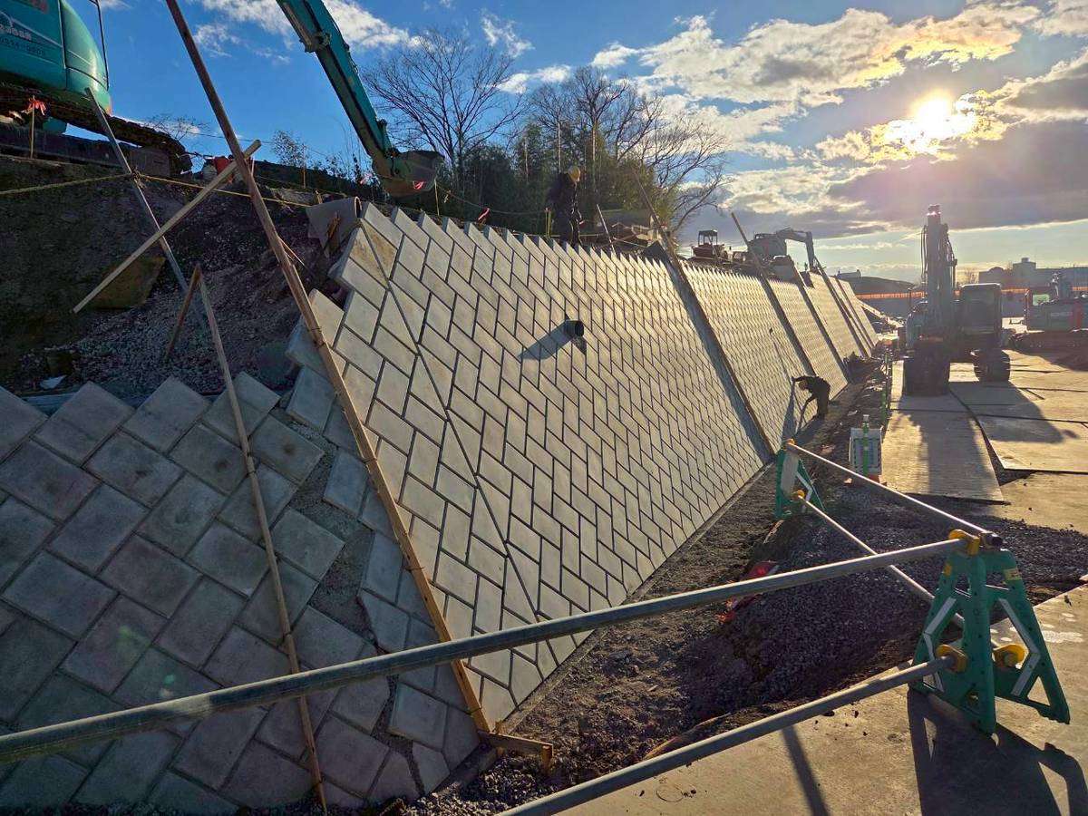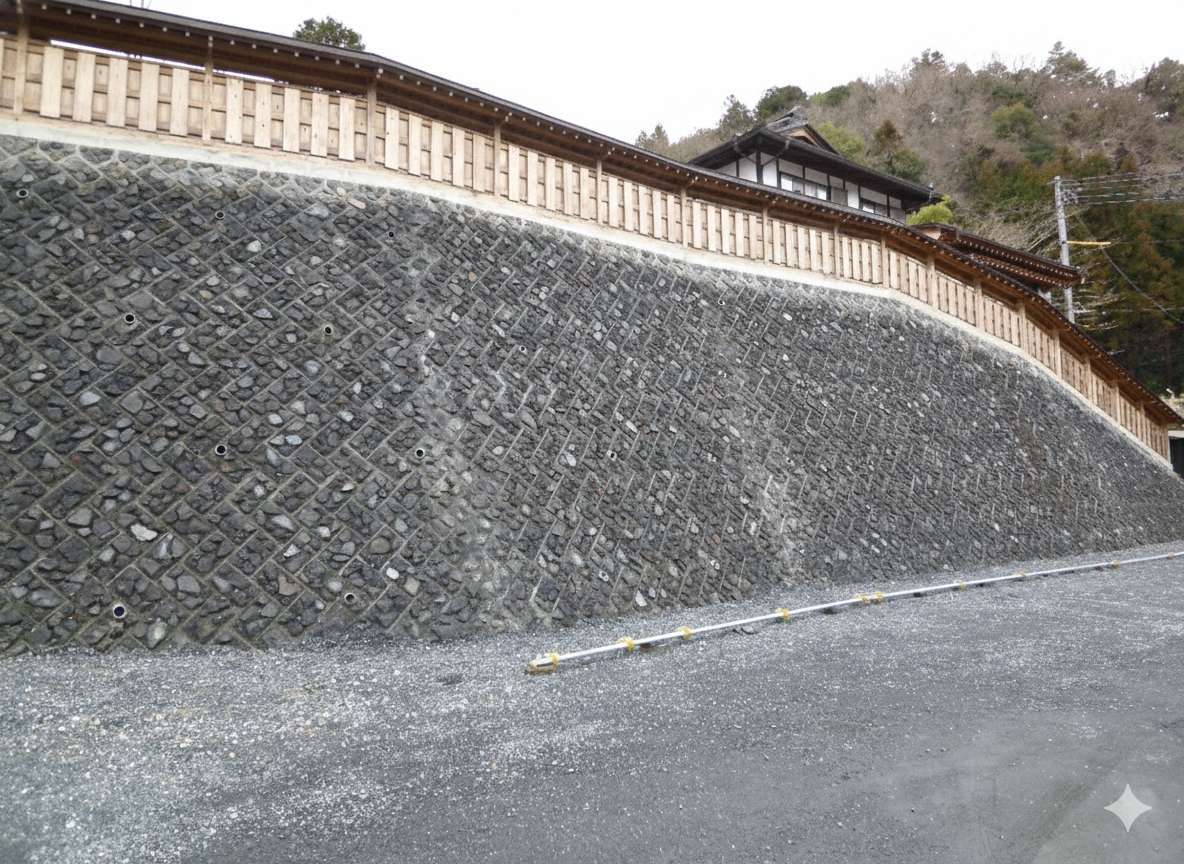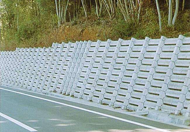 専用ブロックを使ってコンクリートで固定しながら設置し、背面の斜面にもたれかかるような形で設置される擁壁です。