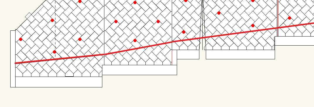 縦断方向には通常は間知ブロックは勾配をとらず、下の図のように水平にして基礎から階段状に段差をつけます。横の赤いラインが地面の高さ(GL)を表しています。(但し、河川は大体河床勾配なりに施工します。)