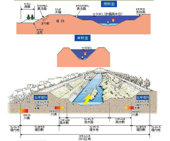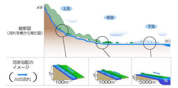 道路に関して話してきましたが河川に関しても、上流から下流へ水の流れる方向に河床勾配があり縦断勾配となります。河床勾配はi=1/50、i=1/100など分数で表記されます。1/100は水平距離100に対して高さが1下がるという事なので1%勾配と同じ意味となります。