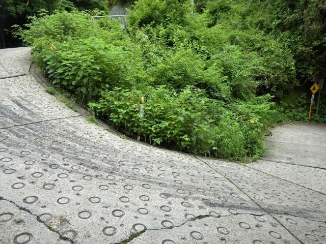 稀に、道路でも境界の関係で、「縦断勾配成り」に間知ブロックを積む事があります。