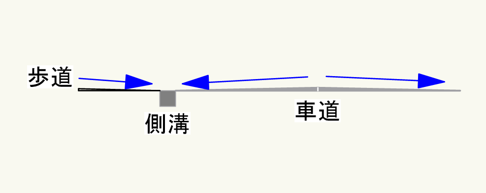 まず、道路には中央から路肩に向かって横断勾配がついています。