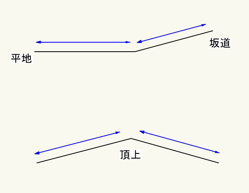 上の図は坂の出入り口と頂上を極端に描いたものです。