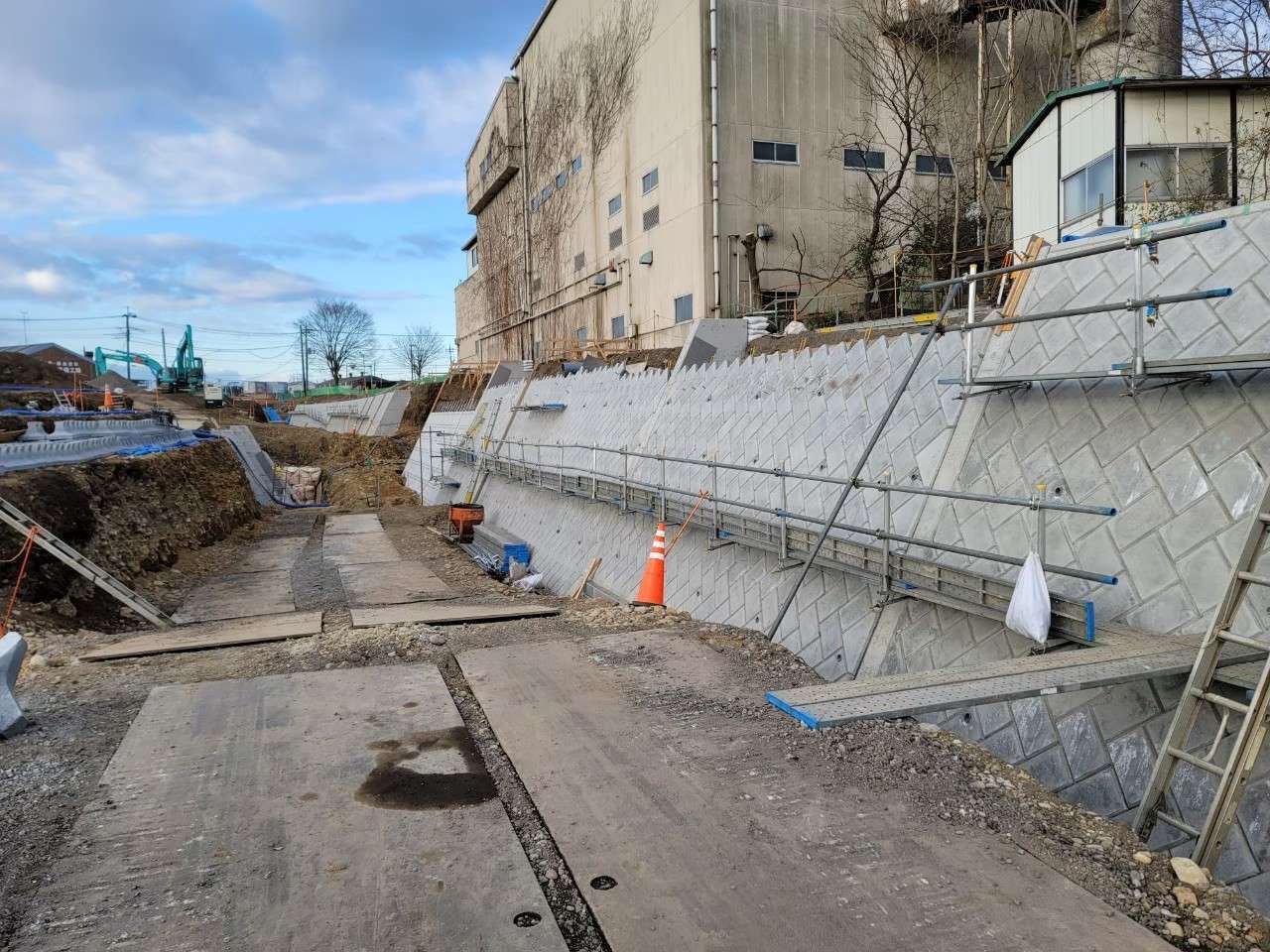 間知ブロック積工事、端末折れ点仕上げ、天端切断取り付け、足場、